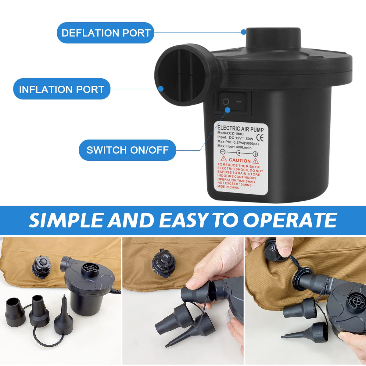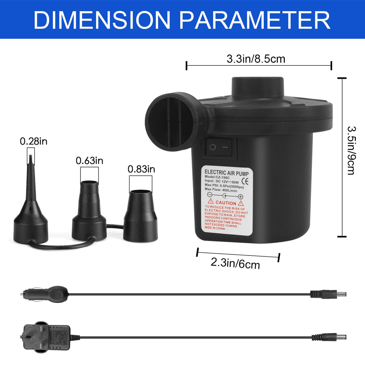 Jsdoin Electric Pump for Inflatables with 3 Nozzles, AC 240V/DC 12V 50W High Power Electric Air Pump for Air Bed Mattress Inflatables Paddling Pool Beach Toys, Fill Inflator Deflator