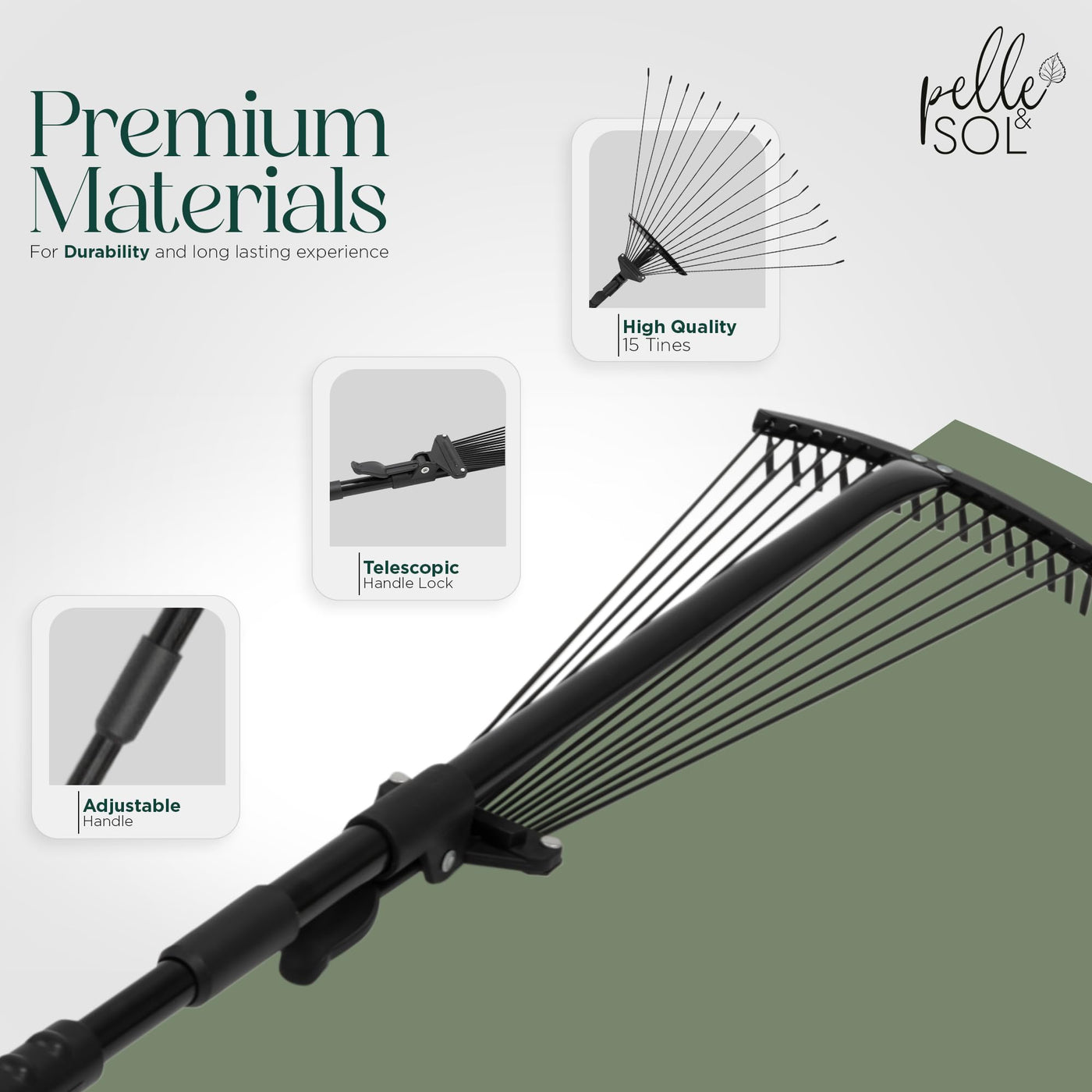 Pelle & Sol Garden Rake - 38-63 Inch Adjustable Lawn Rake for Gardening, Grass w/ 25 Tines for Yard Clean Up - Garden Rakes for Leaves, Lawn Leveller, Yard Clean Up Tool - Black
